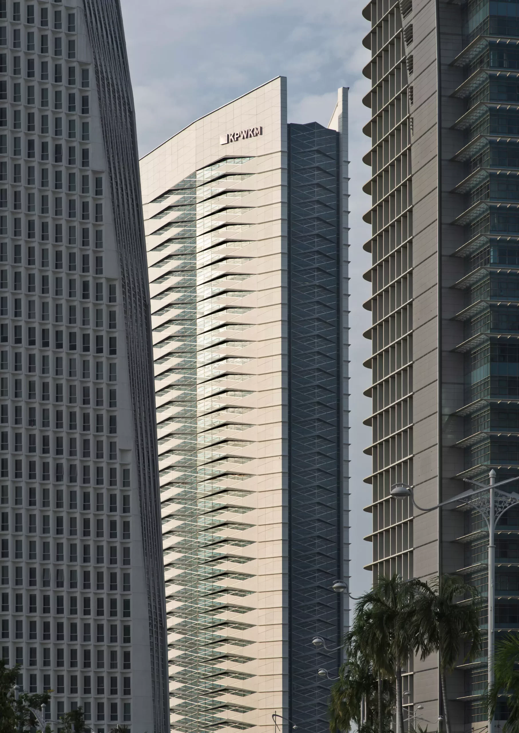 The glazed north and south façades make the most of the main axial views down the boulevard and up to the Convention Centre. The wedge-shaped floor plate follows the site outline, the narrow edge facing the circular open space of Dataran Gemilang.