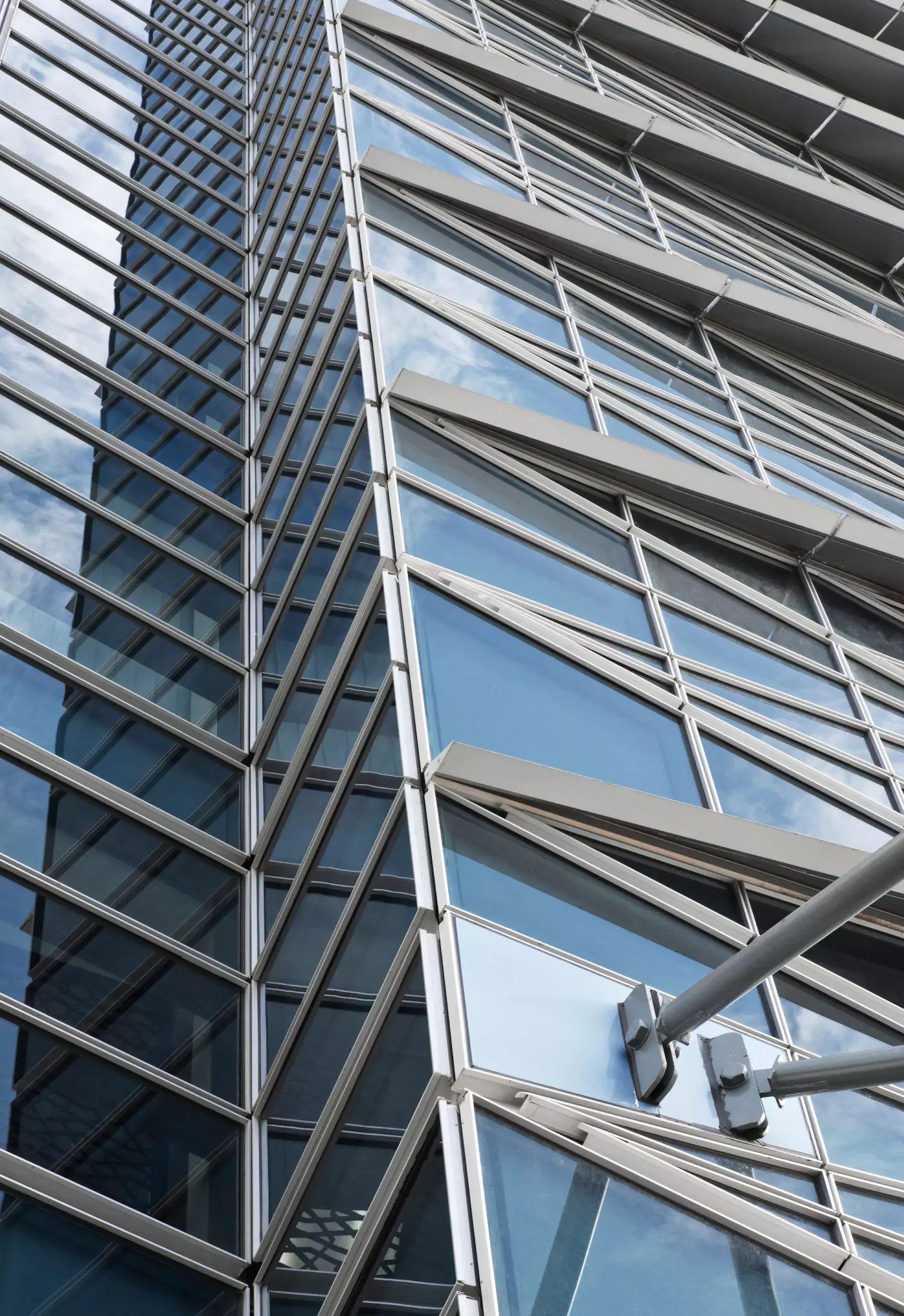 Two-storey eyelids shade East- and West-facing glazed curtain walls and the office spaces within.